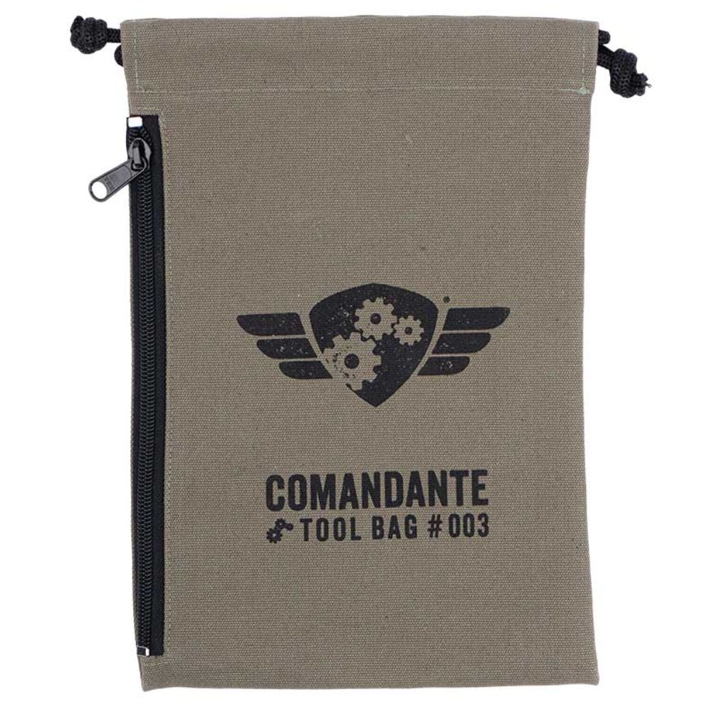 Die Comandante Werkzeugtasche Nr. 3 besteht aus robustem Baumwoll-Außenmaterial (Canvas), weichen und flexiblen Canvas-Taschen und zwei stabilen YKK-Reißverschlüssen. Und die Hauptasche lässt sich mit einer Kordel aus Polyester einfach zuziehen.